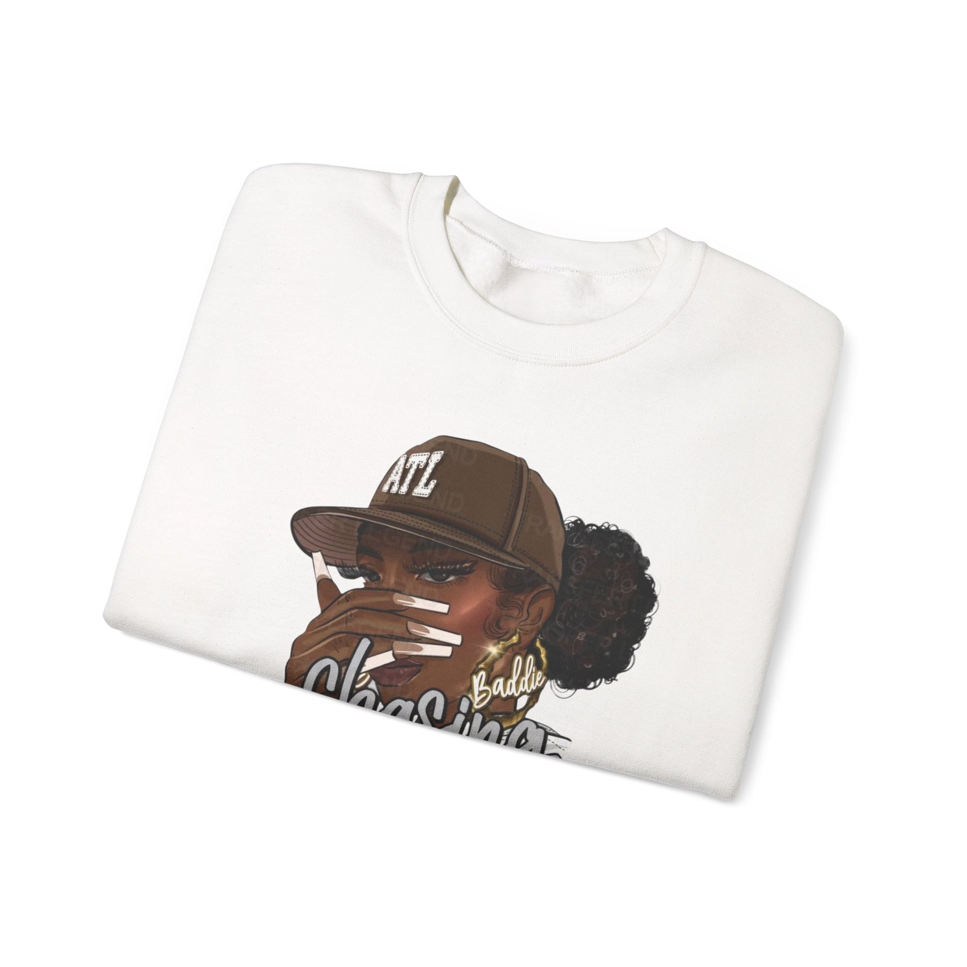 Crewneck Sweatshirt — "Chasing Goals Not People" Graphic (Girl with Cap)