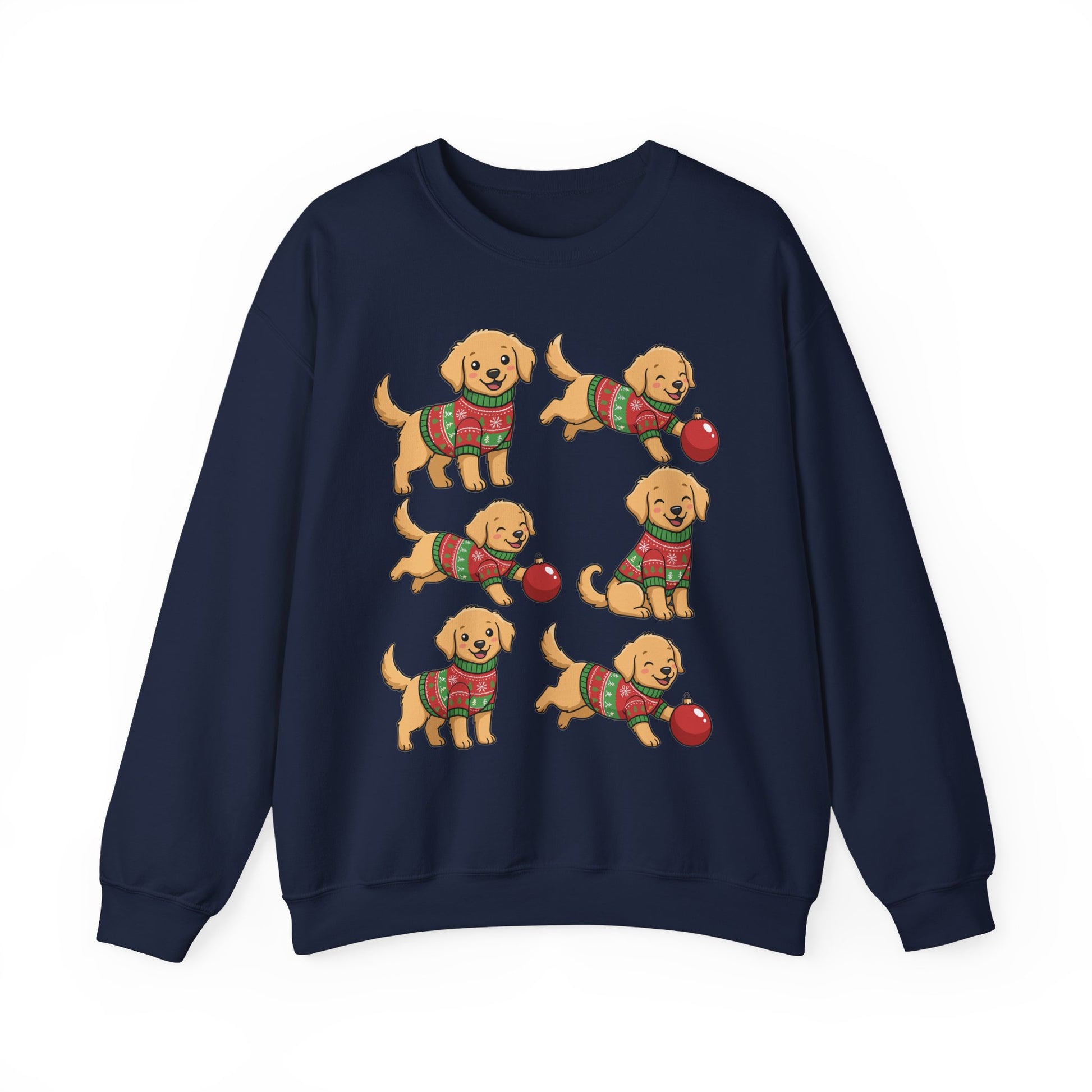 Wrap yourself in cozy, cheerful comfort with this crewneck sweatshirt featuring six playful golden retriever pups wearing festive sweaters and chasing red ornaments. The illustration feels warm and homey — like a quiet morning of wrapping gifts while a happy dog nudges an ornament underfoot. Soft, midweight fabric and a classic crew cut keep the vibe relaxed and lived-in, so you can curl up on the couch, take a brisk walk through frosty streets, or host a low-key holiday movie night with family. The subtle, clean back and tidy ribbed collar let the dog artwork take center stage, while durable double-needle stitching means this sweatshirt will be part of your seasonal rotation for years to come.